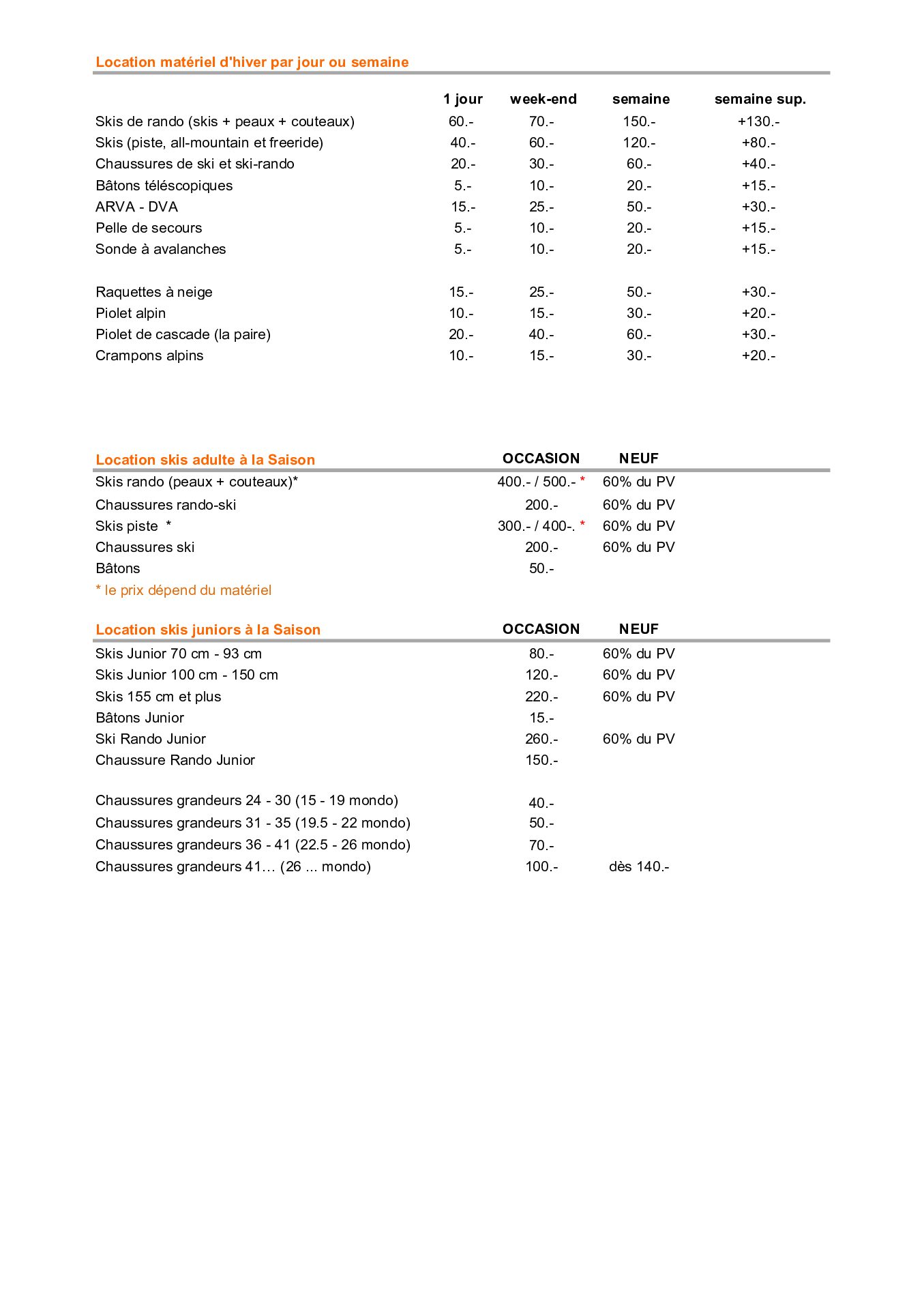 Les prix en vigueur sont ceux disponibles dans les locaux du Loueur.
